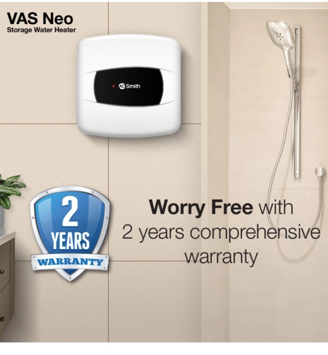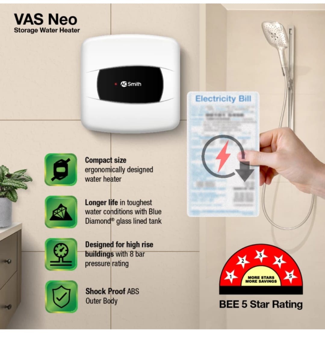 AO Smith 15 Ltr Storage Electric Water Geyser (VAS-NEO-015, Black, White)